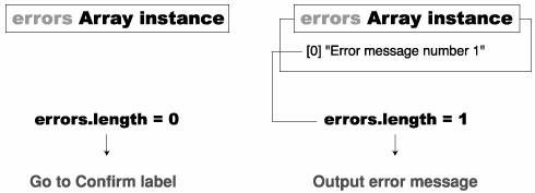 Note We will add more function calls as we define them in the following exercises. The next action in this function is an if statement, which is evaluated only after the validateName() function has completed its job. This is where the sequence of actions becomes important. If an error message is pushed into the errors array as a result of calling the validateName() function, the length property of the errors array is changed to 1, indicating that it contains one error message. This if statement then looks at the length property of the errors array and then acts accordingly. If the length property has a value greater than 0 (indicating error messages within the array), the resulting actions output those messages to the errorLog_lb List component instance. If errors.length is 0, this means there are no error messages and the data is valid; therefore, a gotoAndStop() action sends the Timeline to the frame labeled Confirm.