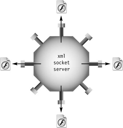 | A socket server is an application that can accept "socket" connections. Socket connections are persistent, which means that they let you remain connected to a server rather than making a connection just long enough to download information before disconnecting. Unlike a scripted page, a socket server is an application that's always running. It can accept simultaneous connections from multiple computers and exchange information among them. While you're connected to a socket server, you can send or receive information at any time. Using socket connections to continually transfer data to and from the server is how most chats and multiplayer games are created in Flash. A key principle to understand about using socket connections with Flash is that you don't have to request information to get informationfor example, in a chat application, a message can be pushed into Flash at any time without Flash having to ask for it.  Introduction to the XMLSocket Class This section provides a basic introduction to Flash's built-in XMLSocket class. This discussion is simply a guide to the use of this built-in class, so you can familiarize yourself with the general concepts needed for plugging your applications into nearly any socket server. The exercise that follows makes use of a special socket server that wraps most of the functionalities you're about to learn into a simple-to-use class. But more on this in a bit. Let's look at the inherent way Flash communicates with a socket server. Before you can connect a Flash movie to a socket server, you must create a new XMLSocket instance, using the constructor for the XMLSocket class. You can then use the methods of the instance to connect to a server and exchange information. In this section, we'll show you how to create and use an XMLSocket instance while also using the XML class methods and properties introduced earlier in this lesson. To create a new XMLSocket instance, you must use the constructor for XMLSocket. Here's an example: var server:XMLSocket = new XMLSocket(); This line of ActionScript creates a new XMLSocket instance named server. To connect the XMLSocket to a server, you simply employ the connect() method using the following syntax: server.connect(hostName,port) The hostName parameter is the IP address on which the socket server residesusually a numeric sequence (for example, 65.134.12.2). IP addresses such as 127.0.0.1 or localhost are valid references to your own computer. If you type http://localhost into your web browser's address bar, it would try to connect to your computer as if it were a website. The port parameter refers to the port on which the server is listening. Flash can connect only to ports higher than 1024. For example: var server:XMLSocket = new XMLSocket(); server.connect("localhost", 9999) You can close a connection with a socket by using the close() method: server.close(); To send information via the socket connection, simply use the send() method and pass in the instance you want to send. For example: server.send("<Text>Hi</Text>"); The XMLSocket class can respond to the following types of events: onConnect This event fires when the connection is accepted or fails. onXML This event fires when information arrives via the socket connection. This action lets you know that new information has arrived so that you can use it. onClose This event fires when the connection with the socket is lost. This event will not fire as a result of purposely closing the connection from Flash using the XMLSocket.close() method. As we did with the onLoad event in the XML class, we have to define these event handlers with the XMLSocket instance that we create. For example: function serverConnected (success:Boolean) { trace(success); } server.onConnect = serverConnected; Here the serverConnected() function is called when the onConnect event is fired. The success parameter in the function definition has a value of true if the connection was successful and false if the connection was unsuccessful. The onXML event is used as follows: function xmlReceived (data:XML) { trace(data); } server.onXML = xmlReceived; The xmlReceived() function is called each time information arrives via the socket. The data parameter contains the XML document pushed into Flash. The onClose event handler can be defined and used as follows: function socketClosed () { //notify the user } server.onClose = socketClosed; You would typically use this type of event to let the user know that a connection has been lost. ElectroServer 3 To utilize the functionality of any socket server, you can't just upload a script into the CGI-bin of your website or place it in a normal web-accessible directory. Usually written in Java, C, C++, or Visual Basic, socket servers generally require root-level access to the web server. This usually means that you must be running your own dedicated server to install and use a socket server. Fortunately, this isn't as scary as it sounds. As a matter of fact, you can set up a socket server on your own personal computer so that you can develop with it, which is a recommended and common practice when developing applications that use a socket server. For the next exercise, we'll show you how to get a socket server up and running on your local machine so that you can go on to build a simple chat application that connects to the socket server. To test it, you'll need to use Windows 98, Windows 2000, Windows XP, Windows ME, or newer. The accompanying CD-ROM contains the installer for a Java-based socket server called ElectroServer 3. To get the latest version of ElectroServer or to find more examples, please visit www.electro-server.com. Note ElectroServer 3 is supported by any operating system that supports the JRE. This includes Macintosh OS-X and higher, Linux, UNIX, Windows, and so on. For non-Windows installation instructions for ElectroServer 3 see www.electro-server.com. The next exercise guides you through the steps to get ElectroServer 3 up and running o