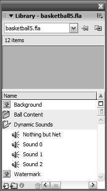 | In nondynamic projects, sounds are placed directly on and controlled from the Timeline. If you want a sound to play in your movie, you must drag it from the library onto the Timeline and then indicate when and how long it should play, as well as how many times it should loop on playback. Although this may be a fine way of developing projects for some, we're ActionScripterswe want control! That's why in this exercise we show you how to leave those sounds in the library and call on them only when you need them. Using other methods available to Sound instances, you'll learn how to add sounds and control their playback on the fly. When you create a Sound instance in Flash, one of the most powerful things you can do with it is attach a soundin essence, pulling a sound from the library that can be played or halted any time you want. To do this, you must assign identifier names to all the sounds in the library. After these sounds have identifier names, you can attach them to Sound instances and control their playback and even their volume and panning, as we discussed earlier in this lesson. For example, let's assume that there's a music soundtrack in the project library with an identifier name of rockMusic. Using the following code, you could dynamically employ this sound in your project and control its playback: var music:Sound = new Sound(); music.attachSound("rockMusic"); music.start(0, 5); When executed, the first line of this script creates a new Sound instance named music. The next line attaches the rockMusic sound (in the library) to this Sound instance. The third line starts the playback of this Sound instance, which in effect starts the playback of the rockMusic soundtrack because it's attached to this Sound instance. The 0 in this action denotes how many seconds into the sound to start playback. For example, if the rockMusic soundtrack includes a guitar solo that begins playing 20 seconds into the soundtrack, setting this value to 20 would cause the sound to begin playback at the guitar solo rather than at the sound's beginning. The second value in this action, which we've set to 5, denotes how many times to loop the sound's playback. In this case, our soundtrack will play five times before stopping. Note You can set all of these values using variables or expressionsopening a world of possibilities. In the following exercise, we show you how to attach a random sound from the library to a Sound instance and trigger its playback whenever the mouse button is pressed. We'll also set up our script so that pressing any key halts the sound's playback. 1. | Open basketball5.fla.