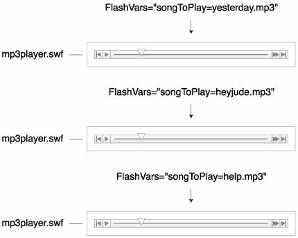Remember, FlashVars not only allows you to use a single SWF file in unique ways on different HTML pages (as demonstrated in this exercise), but you can also use a single SWF file multiple times on a single HTML page, with each instance configured to show a different frame, load a different MP3, show different text, or whatever your imagination suggests. This is an often overlooked yet powerful tool.