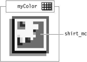 | To use a Color class, you must first create an instance using the Color class constructor. Here's the syntax for creating a new instance of the Color class: var myColor:Color = new Color(shirt_mc); The script creates a new instance of the Color class named myColor and associates it with a movie clip instance named shirt_mc.  You can create the instance anywhere. The constructor accepts one parameter: the path to the movie clip it should modify. If you want to create the instance with ActionScript from within a movie clip that will reference itself, you would use this as the path. For example, the following script creates a new instance of the Color class on the movie clip instance that contains the script: var myColor:Color = new Color(this); Note As with any class instance, you can create many instances of the Color class in a single project and associate them with various Timelines, providing you with dynamic control over the color of many instances simultaneously. The most common Color class method is setRGB(), which changes the color of the movie clip instance specified as the parameter when the instance was created. Here's an example of one use of setRGB(): var myColor:Color = new Color(shirt_mc); myColor.setRGB(0xFF3300); The script creates a new Color class instance named myColor and then uses the setRGB() method to change the color of the shirt_mc movie clip instance to red. This method accepts a parameter (0x) followed by the hex value for a color. The 0x parameter is a reserved character combination that tells Flash that a hexadecimal number follows. The number system that we're accustomed to using is called base 10, which means 10 numbers are used for all values (0 through 9). In other words, all other numbers (28; 6,403; 496; 300, 439; and so on) can be described using a combination of these 10. Hexadecimal numbers, in contrast, are base 16, which means their values are expressed using numbers and letters: 0 through 9 and A through F. Using this method, you can create hexadecimal values of 00 to FF, with 00 a base 10 value of 0, and FF a base 10 value of 255. However, you don't absolutely have to know hex values to describe certain colors when using the setRGB() method. Instead, if you know the RGB value of a color, you can convert it to a hexadecimal value dynamically using the Number class and the parseInt() function. We'll cover this topic in the next exercise (although we won't cover it in detail). In this exercise you'll create a simple interactive scene in which you can change the color of a clown's hair using several buttons. 1. | Open Clown1.fla in the Lesson05/Start folder.
