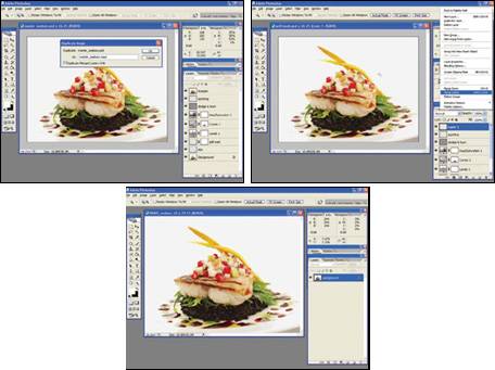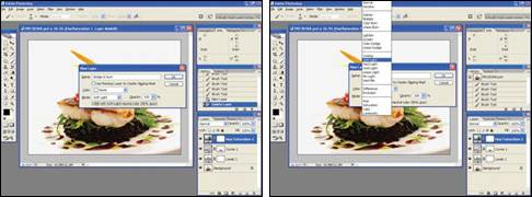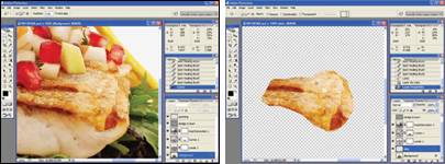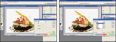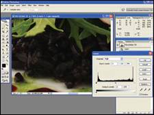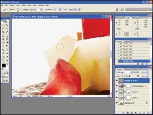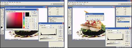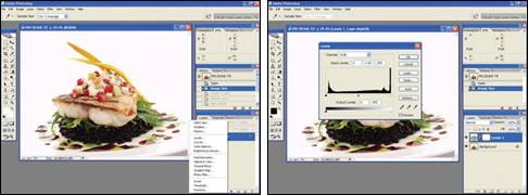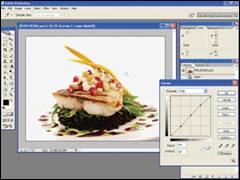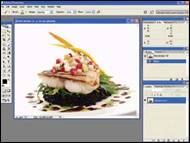 | Retouching food is truly an art. In this section, you'll learn how to use Photoshop to do just that. Before you begin, however, let's quickly go over navigating Photoshop, altering some key Photoshop settings, and understanding layers, which is essential. Navigating Photoshop Before you dive into using Photoshop to retouch the image, take a moment to familiarize yourself with the layout of the program. In particular, note the location of the following: The menu bar The tool option bar The toolbar Palettes Adjusting Your Adobe Photoshop Settings Once you have the lay of the land, take a moment to adjust some of Photoshop's default settings for maximum efficiency: Color settings. From the menu bar, open the Edit menu (PC) or Photoshop menu (Mac) and select Color Settings to open the Color Settings dialog box. The first time you open this dialog box, the Web Graphics Defaults option will be chosen in the Settings drop-down list. Change this to U.S. Prepress Defaults to change the workspace from sRGB to Adobe RGB 1998, which offers a larger color range.  Memory and image cache. From the menu bar, open the Edit menu (PC) or the Photoshop menu (Mac), choose Preferences, and select Memory & Image Cache. In the Memory Usage dialog box, the default is 50 percent. Change this setting to 70 percent so that more RAM is allocated to the program.  Plug-ins and scratch disk. Still in the Preferences dialog box, under Plug Ins and Scratch Disk, select your computer's secondary drive (assuming you have one, and I highly recommend that you do) in lieu of the default setting, Startup. Eyedropper. Go to the Eyedropper icon in the toolbar, where you will see sample sizes on the menu bar. Change the default from Point Sample to 3x3 Average. This will give you a better indication of what the value of a particular area is. White Point Eyedropper. If you use the default RGB values of 255 for the White Point Eyedropper, you wind up with pure white or "paper white," which cannot be reproduced on a printer. To set the white to a point that is reproducible by ink, double-click the White Point Eyedropper (the right Eyedropper icon in the Levels window; it has a clear tip). Change the R, G, and B levels from the default, 255, to 244, and click OK. Photoshop will ask you to save the new defaults after you use levels.  Black Point Eyedropper. If you use the default RGB values of 0 for the Black Point Eyedropper, you get "pure black" with no detail at all. To set the black point such that shadows appear with detail and not simply as pure black blobs, double-click the Black Point Eyedropper (the left Eyedropper icon in the Levels window; it has a black tip). Change the R, G, and B levels from the default, 0, to 10, and click OK. Photoshop will ask you to save the new defaults after you use levels.  Understanding Layers The key to maintaining control of your image is to ensure that you correct one problem at a time using layers. A layer is like an acetate sheet placed over the image, on which corrections are made and effects are added. You can stack multiple layers on top of each other, with each layer containing no more than a few small adjustments. By using layers, you keep the original image intact. Moreover, each layer can be altered or deleted without affecting the other layers. There are several different kinds of layers: The background layer. This contains the original image. Adjustment layers. These include levels, curves, and hue/saturation. You create an adjustment layer by clicking the New Adjustment Layer button, which resembles a half-moon, at the bottom of the window. Type layers. These can be used to add text to your image. Pixel layers. These enable you to duplicate or move elements contained in the original background image or to superimpose elements from other images.  Retouching the Image The retouching process varies depending on the photograph. Simply put, you must open the image in Photoshop and assess it to determine what Photoshop tools you must use to improve it. As you assess the image, determine whether there is a color cast. Use the Eyedropper and the Info window to examine various parts of the image. Is the image too light or dark? If so, you'll need to correct exposure. If the image looks a bit flat, then you'll want to tweak the contrast. Is the image vibrant? If not, determine whether you want to saturate any particular colors. After global corrections have been applied to the image, you can reassess the image for detail corrections. In this section, using the photo shown opposite, we'll address the following picture elements:  In particular, we'll make the following global corrections: Crop and straighten the image if needed. Set the image size to a working resolution of 300dpi. Address the overall color cast with levels in adjustment layers. Use curves to adjust contrast and exposure in adjustment layers. Adjust color saturation to add vibrancy in adjustment layers. In addition, you'll correct fine details through the use of layers and masks. This involves the following: Lightening and darkening certain areas of the image with burning and dodging. Removing spots and blemishes with cloning and healing brushes. Sharpening the image using channels. Finally, you'll save the master file with all its layers intact as a Photoshop document (PSD format), and then duplicate and flatten the image in different formats for various uses.  Cropping and Straightening the Image Sometimes, an image is taken off-level, and you'll need to straighten it. Conversely, you might want to change the horizon to create an angled or off-level effect. To set the level of the image, you use the Measure tool, which is nested underneath the Eyedropper. Note Although you don't need to know them at first, all these tools have keyboard shortcuts, which allow you to move directly to a command or function without using the mouse. Usually, you activate the shortcut by typing the first letter of the tool's name. I will indicat