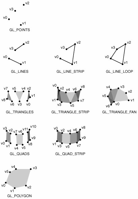 2.1. OpenGL Primitives In OpenGL, applications render primitives by specifying a primitive type and a sequence of vertices with associated data. The primitive type determines how OpenGL interprets and renders the sequence of vertices. 2.1.1. Primitive Types OpenGL provides ten different primitive types for drawing points, lines, and polygons, as shown in Figure 2-1. Figure 2-1. OpenGL primitive types.  OpenGL interprets the vertices and renders each primitive using the following rules: GL_POINTS Use this primitive type to render mathematical points. OpenGL renders a point for each vertex specified. GL_LINES Use this primitive to draw unconnected line segments. OpenGL draws a line segment for each group of two vertices. If the application specifies n vertices, OpenGL renders n/2 line segments. If n is odd, OpenGL ignores the final vertex. GL_LINE_STRIP Use this primitive to draw a sequence of connected line segments. OpenGL renders a line segment between the first and second vertices, between the second and third, between the third and fourth, and so on. If the application specifies n vertices, OpenGL renders n1 line segments. GL_LINE_LOOP Use this primitive to close a line strip. OpenGL renders this primitive like a GL_LINE_STRIP with the addition of a closing line segment between the final and first vertices. GL_TRIANGLES Use this primitive to draw individual triangles. OpenGL renders a triangle for each group of three vertices. If your application specifies n vertices, OpenGL renders n/3 triangles. If n isn't a multiple of 3, OpenGL ignores the excess vertices. GL_TRIANGLE_STRIP Use this primitive to draw a sequence of triangles that share edges. OpenGL renders a triangle using the first, second, and third vertices, and then another using the second, third, and fourth vertices, and so on. If the application specifies n vertices, OpenGL renders n2 connected triangles. If n is less than 3, OpenGL renders nothing. GL_TRIANGLE_FAN Use this primitive to draw a fan of triangles that share edges and also share a vertex. Each triangle shares the first vertex specified. If the application specifies a sequence of vertices v, OpenGL renders a triangle using v0, v1, and v2; another triangle using v0, v2, and v3; another triangle using v0, v3, and v4; and so on. If the application specifies n vertices, OpenGL renders n2 connected triangles. If n is less than 3, OpenGL renders nothing. GL_QUADS Use this primitive to draw individual convex quadrilaterals. OpenGL renders a quadrilateral for each group of four vertices. If the application specifies n vertices, OpenGL renders n/4 quadrilaterals. If n isn't a multiple of 4, OpenGL ignores the excess vertices. GL_QUAD_STRIP Use this primitive to draw a sequence of quadrilaterals that share edges. If the application specifies a sequence of vertices v, OpenGL renders a quadrilateral using v0, v1, v3, and v2; another quadrilateral using v2, v3, v5, and v4; and so on. If the application specifies n vertices, OpenGL renders (n-2)/2 quadrilaterals. If n is less than 4, OpenGL renders nothing. GL_POLYGON Use GL_POLYGON to draw a single filled convex n-gon primitive. OpenGL renders an n-sided polygon, where n is the number of vertices specified by the application. If n is less than 3, OpenGL renders nothing. For GL_QUADS, GL_QUAD_STRIP, and GL_POLYGON, all primitives must be both planar and convex. Otherwise, OpenGL behavior is undefined. The GLU library supports polygon tessellation, which allows applications to render filled primitives that are nonconvex or self-intersecting, or that contain holes. See the "gluTess" set of functions in OpenGL® Reference Manual for more information. 2.1.2. Vertex Sharing Note that GL_LINE_STRIP, GL_LINE_LOOP, GL_TRIANGLE_STRIP, GL_TRIANGLE_FAN, and GL_QUAD_STRIP all share vertices among their component line segments, triangles, and quadrilaterals. In general, you should use these primitives when possible and practical to reduce redundant per-vertex computation. You could render a two-quadrilateral GL_QUAD_STRIP primitive by using GL_QUADS, for example. Rendered as a GL_QUAD_STRIP, your application would need to send only six unique vertices. The GL_QUADS version of this primitive, however, would require eight vertices, two of which are redundant. Passing identical vertices to OpenGL increases the number of per-vertex operations and could create a performance bottleneck in the rendering pipeline. |