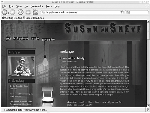 I always loved Mozilla for its great features, but there were little details that I had to look past. With so many components and accompanying programs, I felt like I was loading up a troop of drunken circus elephants every time I started the program. The themes were a great thing to have, but I had to use a theme. That clashed with my carefully matched set of desktop environment themes. The Search button was great, but it was too easy to type search terms into the address bar and press Enter instead of clicking on the Search button, resulting in error messages. I stayed loyal: After all, Mozilla was still my favorite browser for Linux. Then Mozilla heard my unuttered annoyances and answered with the Firefox browser (see Figure 5.2). Figure 5.2. Mozilla Firefox with the Noia Light theme.  Firefox is Mozilla Jr.like Donkey Kong Jr., except that it would make for a boring video game. The program is much lighter and reduces to a more basic set of features. You still have pop-up blocking, tabbed browsing, and a download manager, but there is no mail or composer. The Search button has been replaced with a small search bar next to the address bar that can search a search engine or the current page. There are themes, but they don't take over your whole browser window. The themes are for the toolbar buttons and other icons, leaving the window color and widgets to be controlled by your desktop environment theme. You can also rearrange the toolbar buttons to place them wherever you like and customize which buttons appear. The layout of Firefox is much like that of Mozilla and other browsers, but it rids itself of the remaining Netscape baggage that Mozilla carries. The interface strikes a good balance between the usability of Mozilla and the familiarity for so many users of Internet Explorer. That makes Firefox not only a good browser, but also a good browser to help users transition away from IE. The menus and toolbar buttons are similar to Mozilla's, with a few exceptions for you to explore and poke at. The preferences are again accessible in Edit > Preferences. If you have a slightly older version (before 1.0), the prefs were in Tools > Options. The Preferences dialog box in Firefox is much more usable than Mozilla's. Categories are accessed with five side icons instead of the mouse-clicking frenzy of an expandable tree view. Each category's options are intelligently laid out and are easy to decipher. Firefox isn't just a small, simple browser. Extensions are small add-on programs that you can download to install or install from right inside the browser. An available extension was written for almost anything you can think of, including blogging tools, Web development tools, more complex ad blockers and cookie managers, games, mouse gestures, and extensions to change how pages are displayed. You can open the Extensions dialog box by going to Tools > Extensions. Click Get More Extensions to go to the Web site where all available Firefox extensions are listed. Using extensions is a terrific way to allow users to make their browser as simple or complex as they want to.  | TOOL KIT 5.2Find and Install Extensions in Firefox Blogger.com is a popular blogging site. You can get a whole blog started for yourself at Blogger in less than five minutes. With so many people using their service, a user wrote a Mozilla Firefox extension to provide easy access to Blogger. 1. | Open the Extensions dialog box at Tools > Extensions. There is nothing listed right now, so let's install one.