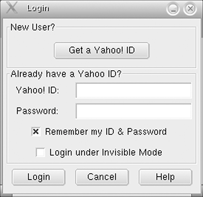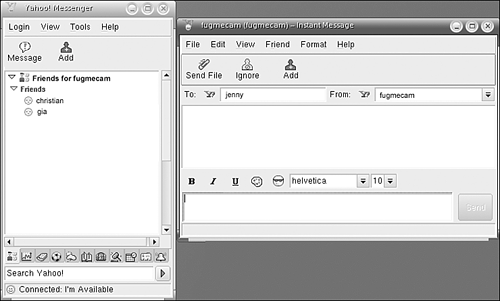 The Linux user community is currently small enough that most companies scoff at making special versions of popular software just to run in Linux. Yahoo! did it. They didn't have to make a Linux version of their IM client, but they listened to users who requested it. Now that we are done praising Yahoo! for being progressive and attempting to serve a wider range of operating systems than its IM competitors, I am free to complain. Yahoo! IM for UNIX (see Figure 10.6) works just fine. Everything functions. However, for a desktop aficionado who likes to have everything look nice, this program hurts the eyes. I need antialiased fonts (the nonjaggy ones) like J. Edgar Hoover needed a nice pair of red pumps and a girdle. Well, I guess he didn't need those, and I probably don't need nice fonts to look at. But, krikey, we want these things. Figure 10.6. Yahoo! Messenger for UNIX, chat window and main window.  Okay, I'm done. It's not a bad program to use. If you only have a Yahoo! account and want to get down to basics with simple conversation windows, this one is for you. Yahoo! Messenger is also good for anyone who might be used to using the Windows version of the program. You will find lots of the features missing and things moved around a bit, but labels and basic functions are the same.  | TOOL KIT 10.3Install and Use Yahoo! Messenger Use Me On first run, you get a setup wizard to step through. Be thoroughly welcomed by the nice words and then click Next. Accept the license agreement. There's no need to read it; you are agreeing to give away all future profits obtained through your participation in the invention of spray-on hair for men. Now you have some check box choices for KDE and for GNOME. Pick the ones you want. Mandrake users need to uncheck all these boxes for the program to launch without error. You can also choose to have Yahoo! Messenger start automatically for you. If you like that, check the box. I tend to never have any program start automatically; it just gives me the willies. After you click Next, the screen says that everything in the world is happy. If you already have a Yahoo! ID, fill in your info and go (see Figure 10.7). If you need to sign up for one, use the Get a Yahoo! ID button, which brings up a browser to the appropriate page on Yahoo!'s Web page. The Remember My ID & Password choice is good when you are not on a public computer. Log In Under Invisible Mode is a feature the Yahoo! protocol has so that you can hide from your ex, or your mother, or anyone you owe money to on your friends list. Figure 10.7. Yahoo! Messenger Login screen.