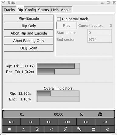 This is one of the most popular programs for ripping audio CDs to a digital format. Other applications are available for ripping, but Grip is the most developed and useful. Grip supports ripping audio CDs to MP3, OGG, WAV, and FLAC. It also has a full-featured CD player built into the program, lookups to an online database for CD information, playlists, and the capability to add and edit ID3 tags. When you rip an audio CD to MP3 files, the most common format that you want to convert to, the tracks on the CD go through a few steps. First, they are converted to uncompressed WAV files. Then they are compressed and encoded into MP3 files. Grip features the capability to simultaneously rip and encode, which makes the long process of ripping a CD go a little faster. Because of the WAV step in the process, you want to make sure that you have plenty of free disk space for Grip to save those WAV files to temporarily. Grip's interface is a series of tabs with settings and options on each tab. CD player controls are in the bottom of the window. The Tracks tab (see Figure 11.2) is a list of the tracks on the CD. The far right column, Rip, is full of check boxes to mark which tracks you want to rip. The Rip tab (see Figure 11.3) is where you start the process, with buttons for Rip+Encode, Rip Only, and two abort buttons. The last button, DDJ Scan, is for use if you have a program called Digital DJ (see http://www.nostatic.org/ddj/) installed. The indicators below those buttons show you progress on current actions. The Config tab is where most of the action is. A lot of options in here might sound cryptic to you. I suggest that you try ripping a few CDs using the default settings first. You can play with adjusting options afterward. You can check out Grip's built-in help docs for information on advanced configuration, but you most likely will need to change only your personal preferences for file naming and locations. The Status tab scrolls status messages in an embedded window. Figure 11.2. Grip's Tracks tab.
