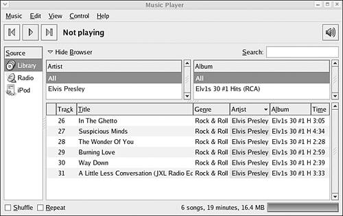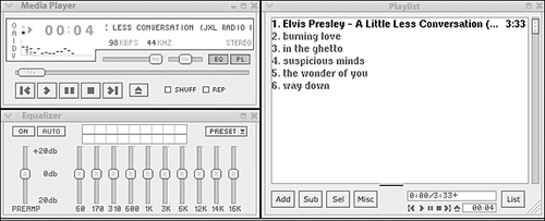 There are so many different ways to listen to music on your computer, in different file formats and with different programs. There are purchased CDs, burned CDs of custom playlists, online music services, and portable music players. I could use the opinion of an expert such as Elvis. I am sure that he has become a digital music aficionado in his old age. If we can't get Elvis's opinion at the moment, how do you differentiate among all of those options? Linux can accommodate most sound and video file formats, and there are a number of good programs to play those formats. That is a lot to choose from. Before I break out the Elvis CDs, we need to learn more about music file types and players in Linux. File Type Fight MP3 is the most ubiquitous audio format, but there are many more. I'm not sure whether you are an audiophile, but many audiophiles argue quite a bit over the best quality level and format for digital music. I'm just a user with a pair of pretty good speakers on my computer. I liked OGG files because they sounded cool and were an open format, but in the end, I have stuck with MP3s simply because it is easier to port them between computers, between operating systems, and onto portable players. See Table 11.1 for a synopsis of the most common audio file formats. Table 11.1. Description of Common Digital Audio FormatsFILE TYPE | DESCRIPTION |