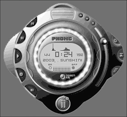 This is KDE's default player. Noatun is pretty plain when you first open it. There are a few basic controls on the toolbar, a couple menus, and a big progress slider to indicate where you are in the file you are playing. You can open other Noatun windows along with the main window, such as a playlist and visualizer. The program supports a variety of media types, including OGG, MP3, and WAV files. Another cool feature available is skinning (see Figure 11.5). Figure 11.5. Noatun with the Phong skin.