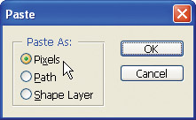 Switch to Photoshop, and with your document selected, choose Edit | Paste. The Paste dialog box appears.
