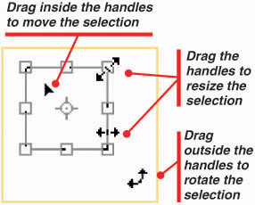 Handles appear at the sides and corners of the selection. Drag these handles or the lines that connect them to resize the selection.