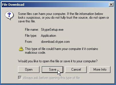 Figure 3-2. Saving the Skype installer on your computer It does not matter where you save this file as long as you remember where it is. Common alternatives to the default location are the Windows Desktop or My Documents folder.
