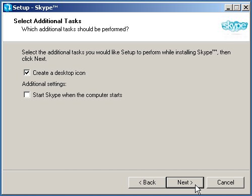 Figure 3-4. Choose additional installation tasks  By default, Skype will start automatically and then run in the background when you turn on your computer. If your computer usually is connected to the Internet, this option is fine. If your computer generally is not connected to the Internet, do not have Skype start automatically, because when your computer boots up and is not connected to the Internet, Skype will continue trying to connect to the Internet until it succeeds or you quit the application. Other options include creating a desktop icon and/or quick-launch icon. Choosing one or both of these options is fine. A desktop icon allows you to start Skype by clicking an icon on your desktop. A quick-launch icon displays in your Windows taskbar. | 6. | Click Next.