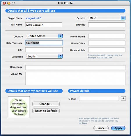 Figure 4-5. Edit Profile window for the Mac  | 10. | Fill in as many fields as you feel comfortable disclosing to others.