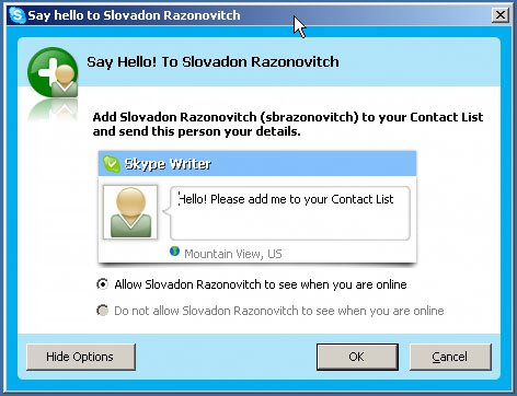 When you add a new contact, you will see the Send Your Details window, allowing you to notify the contact that he or she has been added to your Contacts List (see Figure 4-11). You can also choose whether you want this person to see your contact details, such as your full name and online status. (Online status lets other Skype users know when you are online and available for communicating.)
