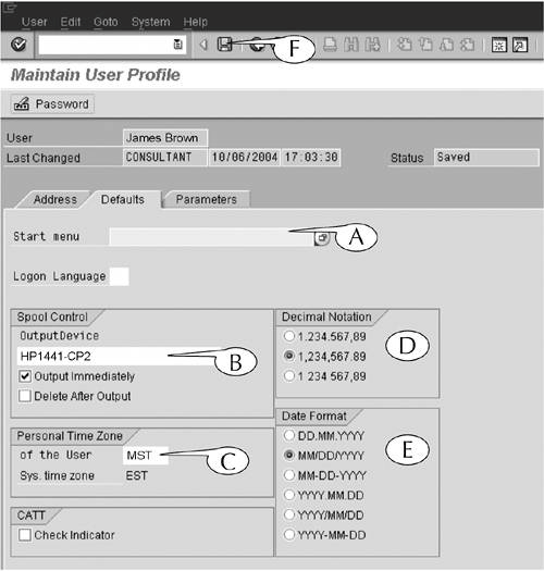 | Step 2. | The Maintain User Profile popup screen appears (Figure 3.2). It can display three subscreens, which you select with the tabs (A) at its top. You can enter your user profile data on two of its subscreens: Address and Defaults.