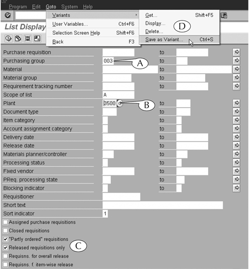 | We now demonstrate the procedure for creating and saving screen variants. This procedure can be used on all initial screens, but for an example, we create a variant for the initial screen of the ME5A list-display transaction (Figure 13.7). This transaction creates a list of related requisitions for the purchase of materials. Figure 13.7. The initial screen for the ME5A transaction, set up with our usual choices of selection criteria and showing the menu path for creating a screen variant.  This initial screen contains many data entry fields and selection boxes for defining the selection criteria for the output report. We set up our initial screen, for instance, as follows. We enter the code for the purchasing agent who handles requisitions for our department in the Purchasing group field (A) so that the report only lists the requisitions for our department. We enter the code for our work location in the Plant field (B) so that the report is limited to materials that are delivered there, rather than to another office of our department in another state. We select the Partly ordered requisitions and Released requisitions only options (C) so that the report is limited to materials that have not been delivered. We always make these same three entries and selections whenever we run this transaction, because they always yield a list of all our requisitions. Sometimes, however, we cut down the length of this list by adding more selection criteria in other fields. For example, when we want to limit the list to the requisitions for a specific material, we enter its code in the Material field; when we want to limit the list to materials from a specific source, we enter a vendor code in the Fixed vendor field; and so on. By the same token, we never enter selection criteria in many other fields, including the Document type, Release date, Order, and Materials planner/controller fields, because we do not track these data in our work (though users in other departments do). In addition, we never select the Assigned purchase requisitions option (we don't assign requisitions in our company) or Closed requisitions option (we are not interested in completed requisitions). Given the way that we use this transaction, we created a customized variant of its initial screen by following the steps in this next procedure. Procedure: Creating a Variant of an Initial Screen Step 1. | Navigate to the default initial screen of the transaction.
