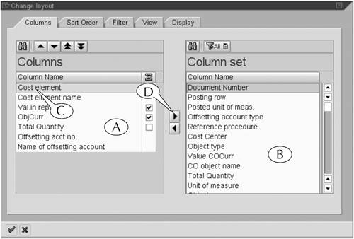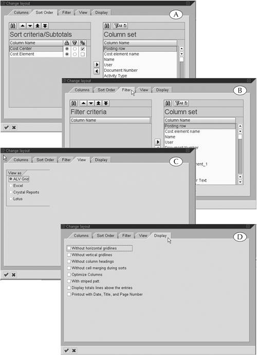 | This completes the procedure for creating a display variant. Where you once had a line-item report of dubious utility, you now have a report that shows the data you need to see, and only that data, in a well-organized layout (Figure 15.13). This is the essence of a good report: It presents the least amount of data to convey the most amount of information. The data in our sample reportthe cost element name, employee name, costs, and so onare all needed to address the question: Who spent our money on what? There are no data in this report that do not address this question, for they would distract the reader from its messageand consume additional space while they did so. | We mentioned earlier that there are four other subscreens on the Change Layout screen, but we did not use them in this procedure. Frankly, we never use them when we are working with display variants, because their functions are more easily performed on the output screen itself. For example, the Sort order, Filter, and View subscreens (Figure 15.14A, B, and C) could be used to sort and filter the data in a line-item report and convert it into an MS Excel spreadsheet. However, we prefer to perform such functions directly on the output screen, where we can see immediately the results of our effort. Figure 15.14. The four remaining subscreens of the Change Layout screen.  The Display subscreen (Figure 15.14D) is perhaps the exception to this rule because it enables you to quickly remove row and column guidelines, column headings, and other features from a line-item report. However, the default settings on this screen are set to make the report very readablethe guidelines, for instance, help a reader follow a line of data across the screenand we have never had reason to change them. Of course, you can use these subscreens at any time if you prefer. The first two subscreens work exactly like the Columns subscreenyou transfer certain datatypes into the left window and then sort, sum, and filter them thereand you select or deselect the options on the other two subscreens by clicking their selection boxes. |