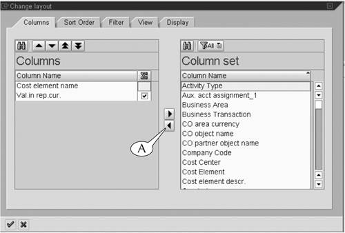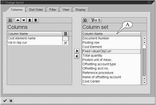 For this example, we removed the Cost element, ObjCurr, Total quantity, Offsetting account no., and Name of offsetting account datatypes from the Columns window, leaving behind only Cost element name and Val in rep cur (Figure 15.7).