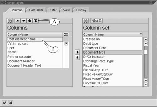 Figure 15.9. The desired datatypes are now in the Columns window and will appear in the display variant. Use the positioning buttons (A) to rearrange selected datatypes (B).
