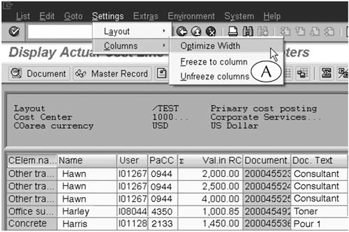 - Adjust all the columns at once by following the menu path Settings > Columns > Optimize Width (Figure 15.11A). The system adjusts the width of all columns so that they fully display all their contents.