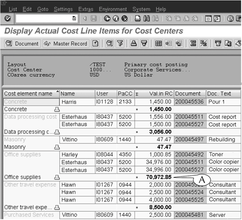 Figure 15.13. The display variant is now grouped by cost element name, and the groups are subtotaled (A). It is now finished.