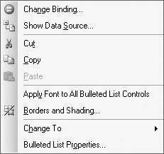 If you are creating your data source on-the-fly, a group and a field are inserted for your list; otherwise, the standard Binding dialog box appears, enabling you to bind your list to an existing group within your data source.