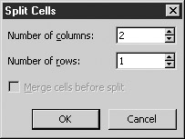 To split a cell, right-click within the cell that you want to divide, and select Split Cells to open the dialog box shown here.