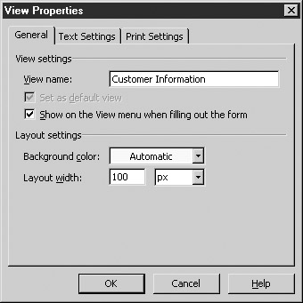 You can use the General tab to change the name of a view. The options immediately below the View Name text box control whether this view is the default (that is, it is shown when the form is opened) and whether or not the view is shown in the Views menu when the form is previewed or filled out.