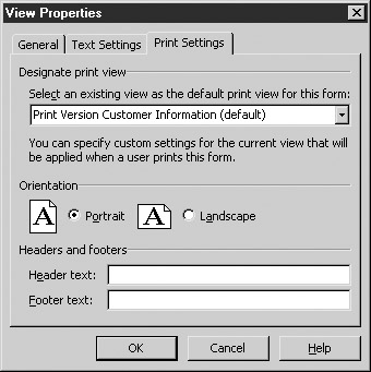 Another important use of views is to provide an alternate version of a form for printing purposes. You can set the printing options for a particular view through the Print Settings tab, shown here.