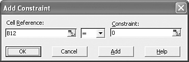 Figure 2.20. Use the Add Constraint dialog box to specify the constraints you want to place on the solution.  | 6. | If you want to enter more constraints, click Add and repeat steps 35. For the example, you also need to constrain cell C12 (the Product Profit formula for the Langstrom wrench) so that it, too, equals 0.