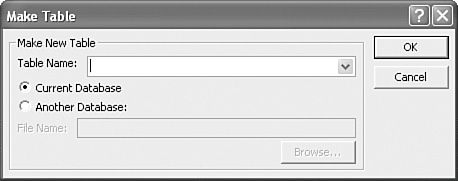 Figure 4.24. Use the Make Table dialog box to define your new table.  | 4. | Use the Table Name text box to enter the name you want to use for the new table.