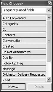 Figure 5.1. Use the Field Chooser dialog box to customize the fields displayed in the message list.  Here's a rundown of a few other field customization chores you can perform: Outlook has a "big picture" method of customizing columns. To try it, select View, Arrange By, Custom, and then click Fields. In the Show Fields dialog box that appears, the Select Available Fields From list contains the various categories of message fields. You also see two lists: the Available Fields list shows the field headings you can use, and the Show These Fields in This Order list shows the current field headings. Use the Add and Remove buttons to customize the field selection. You can also use the Move Up and Move Down buttons to adjust the field order. To move a field, drag its header left or right within the column header area. To size a field, drag the right edge of the field's header to the left or right. If you want a field to be as wide as its widest entry, right-click the field header and then select Best Fit. To change how text is aligned within a field, right-click the field's header, select Alignment, and then select Align Left, Align Right, or Center. Creating a Custom Field Outlook also enables you to create custom fields where the displayed value is based on a formula that you build. Display the Field Chooser dialog box and click New. (Alternatively, display the Show Fields dialog box and click New Field.) Enter a name for the field and then use the Type list to select Formula. Type the formula into the Formula text box or click Edit to use the Formula Field dialog box, which offers lists of the available fields and functions. For example, suppose you create a field named "Conference" and you want it to display "Yes" if the message subject contains the word "Conference." Here's the formula to use: IIf(Instr([Subject],"Conference") <> 0, "Yes", "") This formula uses the Instr function to see if the [Subject] field contains the word Conference. If so, the word Yes is returned; otherwise, a blank string is returned. After you create the field, it appears in the User-Defined Fields in Inbox category, and you can add it to the Inbox fields from there. |