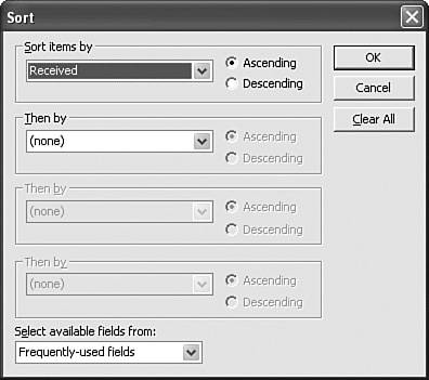 Sorting the Messages By default, Outlook sorts the Inbox messages in descending order according to the values in the Received column. Similarly, messages in the Sent Items folder are sorted by the values in the Sent column. But you're free to sort the messages based on any displayed column. Following are the techniques you can use: Click the header for the field you want to use for the sort. An arrow appears beside the column name to tell you the direction of the sort (an up arrow for ascending and a down arrow for descending; clicking the header toggles the sort direction). Right-click the header of the field you want to use and then select either Sort Ascending or Sort Descending from the context menu. Select View, Arrange By, and then select the field on which you want to sort. Select View, Arrange By, Custom, and then click Sort to display the Sort dialog box, shown in Figure 5.2. Use the Sort Items By list to choose the first field you want to use for the sort, use Then By to select a second field, and so on. In each case, activate either Ascending or Descending. Click OK to put the sort order into effect. Figure 5.2. Use the Sort dialog box to sort your messages.