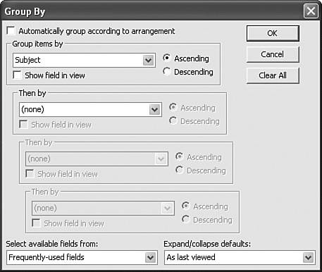 | 4. | Use the Group Items By list to choose the first field you want to use for the grouping and then activate either Ascending or Descending. (If you don't see a field you want, use the Select Available Fields From list to select All Mail Fields.)