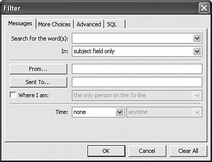 Figure 5.5. You can use the Group By box to work with your groups. Here's a summary of the various techniques you can use with the Group By box to adjust your groupings: Click the field button inside the Group By box to toggle the group sort order between ascending and descending. To add an existing message list field to the grouping, drag the field's header into the Group By box. To add any other field to the Group By box, right-click any field header, select Field Chooser to display the Field Chooser dialog box, and then drag the field you want to use into the Group By box. If you have multiple fields in the Group By box, you can change the subgroupings by dragging the field buttons left or right. To remove the grouping, either drag the field button outside the group box or right-click the field button and choose Don't Group by This Field. Filtering the Messages Grouping messages often makes them easier to deal with, but you're still working with all the messages inside the folder. To really knock a message list down to size, you need to filter the messages. When we looked at views earlier, we saw that certain views displayed only selected messages. For example, choosing the Last Seven Days view reduced the message list to only those missives that were received in the last week. As with groups, Outlook makes it easy to design your own filters. You'll soon see that filtering is one of Outlook's most powerful (and potentially complex) features. Yes, you can perform simple filters on field values, but Outlook can take you far beyond these basic filters. For example, you can filter messages based on words or phrases in the subject or body. To get started, select View, Arrange By, Custom, and then click Filter. The Filter dialog box that appears, shown in Figure 5.6, contains four tabs: MessagesUse the controls in this tab to set message-based criteria. For example, you can enter a word or phrase in the Search for the Word(s) text box and select an item from the In drop-down list (for example, Subject Field Only). Outlook will filter messages that contain the word or phrase in the chosen item. More ChoicesThis tab lets you fine-tune your filter. For example, you can set up a case-sensitive filter by activating the Match Case check box. You can also filter based on categories, read status, attachments, priority, importance, flag status, and size. AdvancedThis tab lets you set up sophisticated criteria for your filter. Use the Field list to choose a field; use the Condition list to select an operator (such as Contains or Is Empty); and use the Value list to enter a criteria value. Click Add to List to add the criteria to the filter. SQLThis tab displays the Structured Query Language (SQL) command created by the choices you made in the other three tabs. You can edit the SQL statement directly, but you're better off working with the controls in the other tabs to generate the SQL automatically. Figure 5.6. Use the Filter dialog box to set up a custom message filter.  Defining a Custom View If you go to a lot of work to set up a sort order, grouping, or filter, it seems a shame to have to repeat the process each time you want to use the same view. Happily, Outlook saves you that drudgery by letting you save custom sorts, groupings, or filters. In fact, Outlook goes one better by letting you save combinations of these views. In other words, you can define a view that includes a sort order, a grouping, and a filter. And, for added convenience, these views are available along with Outlook's predefined views, so they're easy to implement. Here are the steps to follow to create a custom view: 1. | If you want to apply the view to a specific folder, select the folder.