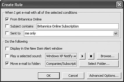 | 5. | If the Create Rule dialog box doesn't have the exact conditions or actions you want, click Advanced Options to use the Rules Wizard to complete the rule. Otherwise, click OK.