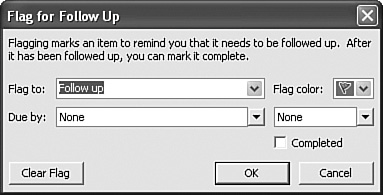 Figure 5.11. Use the Flag for Follow Up dialog box to set a message follow-up reminder.  | 3. | In the Flag To list, select the reason for the flag (Call, Forward, Reply, and so on).