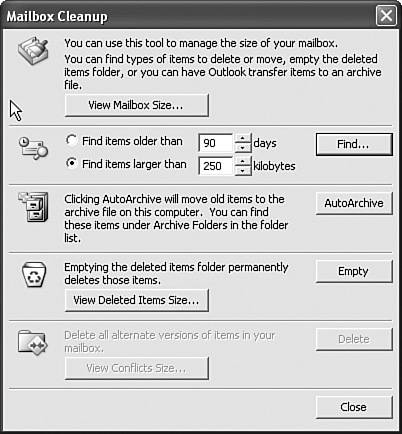 | Cutting Your Mailbox Down to Size The busier your email life is, the larger your Outlook mailbox gets. Having a massive mailbox not only makes it hard to find the messages you want, it also slows down Outlook's performance. To avoid these problems, use the Mailbox Cleanup tool to delete old or large items, archive items, and clean out the Deleted Items folder. To display this tool, select Tools, Mailbox Cleanup. Outlook displays the Mailbox Cleanup dialog box, shown in Figure 5.12. Figure 5.12. Use Mailbox Cleanup to reduce the size of your Outlook mailbox and improve performance.  Here's how to use this tool: Click View Mailbox Size to keep track of the size of the Outlook mailbox. The Folder Size dialog box that appears tells you the overall size of the mailbox as well as the size of each folder. Click Close when you're done. To find old messages, activate Find Items Older Than X Days and then click Find. The messages are displayed in the Advanced Find, and from there you can delete or move the messages. To find large messages, activate Find Items Larger Than X Kilobytes and then click Find. Again, the messages are displayed in the Advanced Find, and from there you can delete or move them. To archive messages, click AutoArchive. Setting AutoArchive Options To configure the default settings for AutoArchive, select Tools, Options, select the Other tab, and then click AutoArchive. The dialog box that appears enables you to turn archived items on and off, set the AutoArchive frequency, and more. If you want special AutoArchive settings for a particular folder, right-click the folder, click Properties, and then select the AutoArchive tab. |