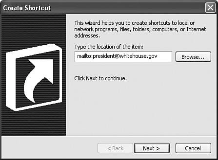 | Figure 5.13. Enter mailto:address to create an email shortcut for an email recipient.  Having Replies Sent to a Different Address If you have multiple accounts, when you compose a new message or reply to or forward an incoming message, you can click Accounts in the toolbar to choose from which account the message is sent. Normally, any replies to your message are sent to that account. However, that might not be convenient for you. For example, you might be sending the message from an account that is scheduled to be deleted soon and you want replies to go to your new account. Or you might prefer that replies go to your assistant or someone else in your department. Similarly, you might be sending a business message from home and prefer that replies go to your business address. For these situations, you can specify an alternative address to which replies will be sent: 1. | In the message window, click Options to display the Message Options dialog box, shown in Figure 5.14