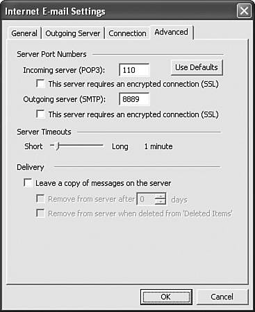 | Using a Different SMTP Port For security reasons, some Internet service providers (ISPs) insist that all their customers' outgoing mail must be routed through the ISP's Simple Mail Transport Protocol (SMTP) server. This usually isn't a problem if you're using an email account maintained by the ISP, but it can lead to problems if you're using an account provided by a third party (such as your website host): Your ISP might block messages sent using the third-party account because it thinks you're trying to relay the message through the ISP's server (a technique often used by spammers). You might incur extra charges if your ISP allows only a certain amount of SMTP bandwidth per month or a certain number of sent messages, whereas the third-party account offers higher limits or no restrictions at all. You might have performance problems, with the ISP's server taking much longer to route messages than the third-party host. You might think that you can solve the problem by specifying the third-party host's SMTP server in the account settings. However, this doesn't usually work because outgoing email is sent by default through port 25; when you use this port, you must also use the ISP's SMTP server. To work around this, many third-party hosts offer access to their SMTP server via a port other than the standard port 25. Here's how to configure an email account to use a nonstandard SMTP port: 1. | Select Tools, E-mail Accounts.