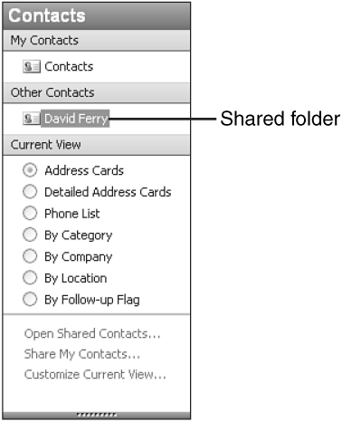 | Opening Shared Nonmessage Folders For nonmessage folders, you can also click the Open Shared Type link in the Navigation pane, where Type is the type of folder (for example, Open Shared Contacts). |