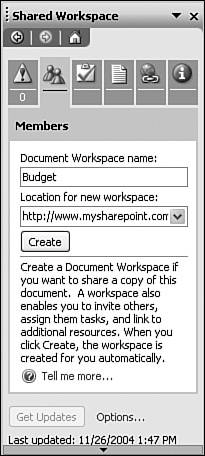 View Properties Displays various properties of the document, including its name, title, and the date and time it was created and last modified. Edit Properties Enables you to change the document's Name and Title properties. Delete Deletes the document. Check Out Checks out the document from the library, which means that no other user can make changes to the document. After you select this action, the document library's Check Out To column displays your username. Check In (this item appears only when the document is checked out) Checks the document back in. The page that appears gives you the option of checking the document in, checking in only the changes you made while keeping the document checked out, or undoing your changes. Version History Displays the document's versions, assuming you enabled file versions when you set up the library. You can view versions, restore a document to an earlier version, and delete versions. Alert Me Configures an email alert to be sent to you when the document changes. Discuss Opens the document and adds a Discussions bar that enables you to have an online discussion with other members about the document. Create Document Workspace Creates a new document workspace centered around the document. See the next section for more information about shared workspaces. Collaborating with a Shared Workspace A shared workspace is a kind of mini version of a SharePoint site, except that it's usually associated with a document instead of a larger entity such as a project or department. For example, if you have a team working on a budget workbook, you could create a shared workspace for that document, which not only allows members to work on the document, but also allows the team to perform other SharePoint tasks such as discussions, announcements, meetings, and so on. Assuming you have the appropriate permissions, you can create a shared workspace for a document in Word, Excel, or PowerPoint by following these steps: 1. | Open the document you want to share.