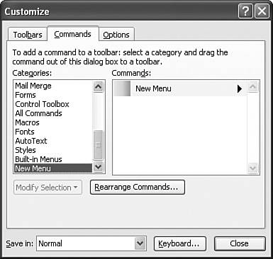 Figure 10.4. Use the Commands tab in the Customize dialog box to create new menus in the application.  | 4. | In the Commands list, click and drag the New Menu item up to the menu bar. You'll see a vertical bar that marks the spot where the new menu will appear. When the bar is positioned where you want your menu, drop the New Menu item.