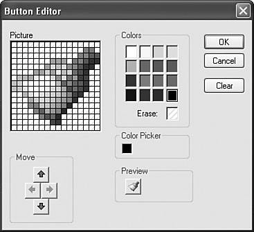 Figure 10.5. The Button Editor lets you design your own toolbar buttons.  | 4. | If you want to create the button from scratch, click the Clear button.