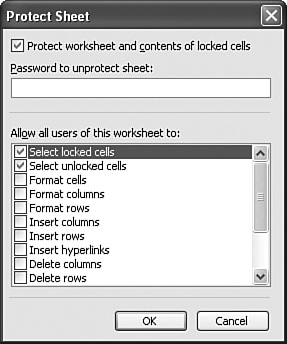 Figure 14.7. Use the Protect Sheet dialog box to activate your protection formatting.  | 2. | For added security, enter a password in the Password to Unprotect Sheet text box. This means that no one can turn off the worksheet's protection without first entering the password.