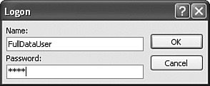Figure 14.12. When you open a secured database, you must log on with a username and password.  | 15. | Enter the Name and Password of the user and then click OK.