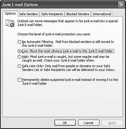| 2. | The Options tab, shown in Figure 15.7, gives you four options for the Junk E-mail protection level:
