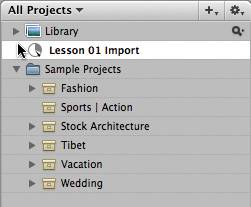 | 2. | Press Command-N to create a new project, and name your project Lesson 01 Import. The Import arrow will shift to indicate that Lesson 01 Import is the new import destination.