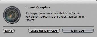 Note Aperture stores your images, so it's safe to erase the contents of your card once the import is complete. If you wish to leave your card or camera mounted, then simply click Done. | |