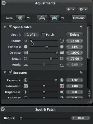The Spot & Patch parameters are added to the Adjustments HUD. You will notice that a small Spot & Patch window also opens with a Radius control. Use this Radius control to adjust the radius of your selection area.